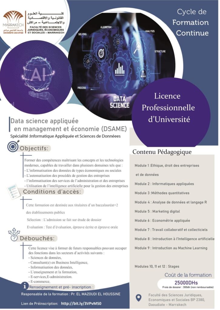 Avis de préinscription à la Licence Professionnelle en Data Science Appliquée au Management et à l’Économie (DSAME) – AU 2025-2026
